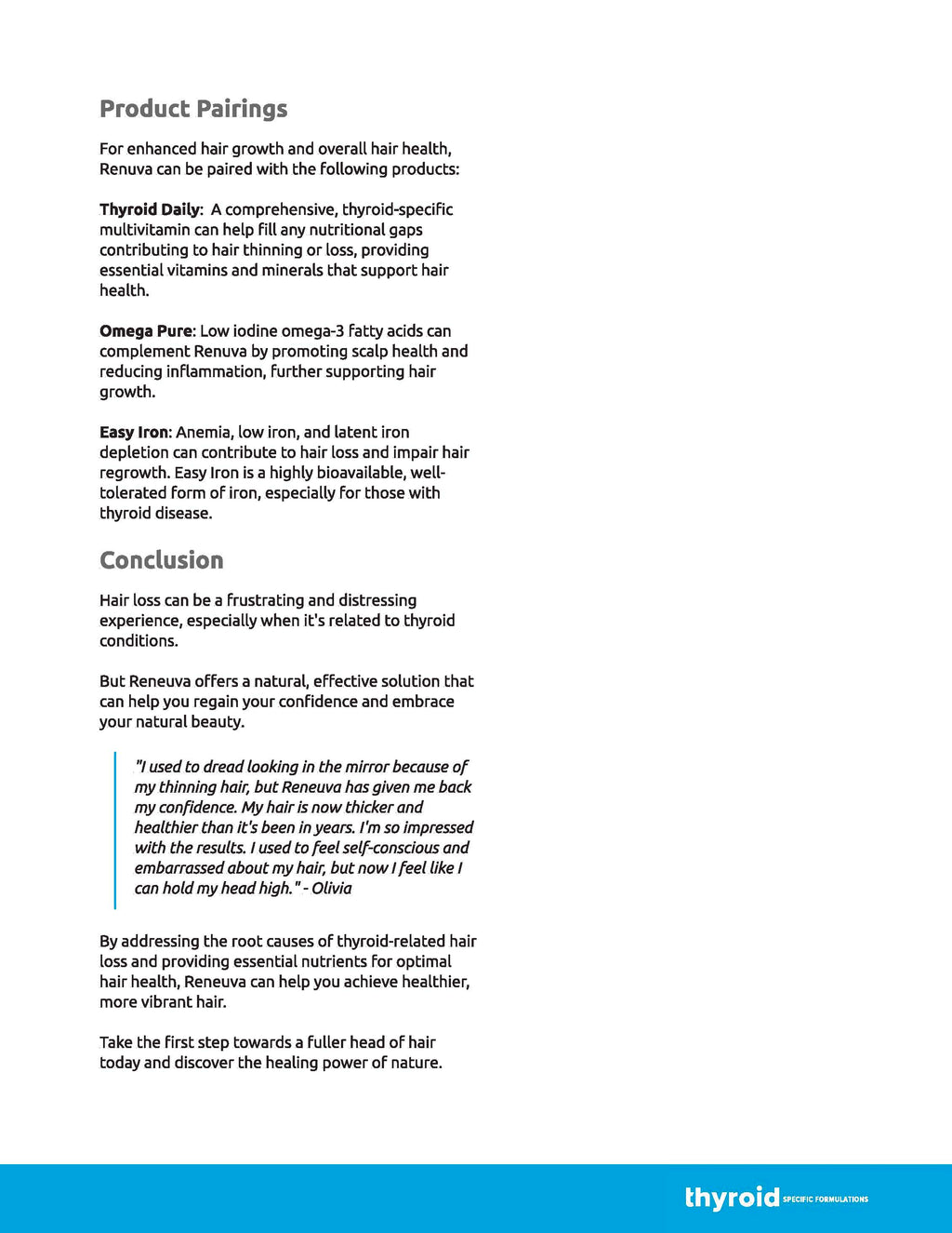 Reneuva is your partner in restoring hair health and confidence. By addressing the root causes of thyroid-related hair loss and delivering essential nutrients for hair growth, Reneuva helps you feel your best—inside and out.